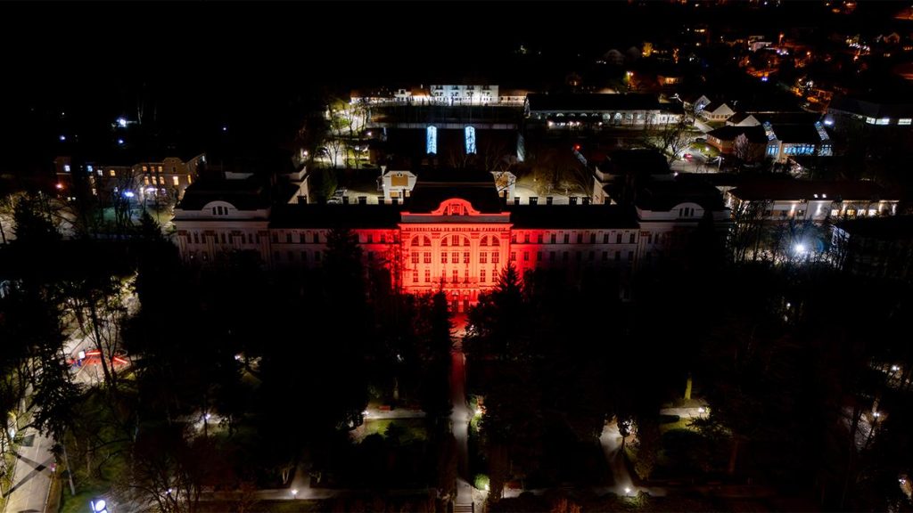 Clădirea principală a UMFST G.E. Palade Târgu Mureș a fost iluminată în culoarea roșie, reprezentativă pentru Serviciul de urgență 112.
