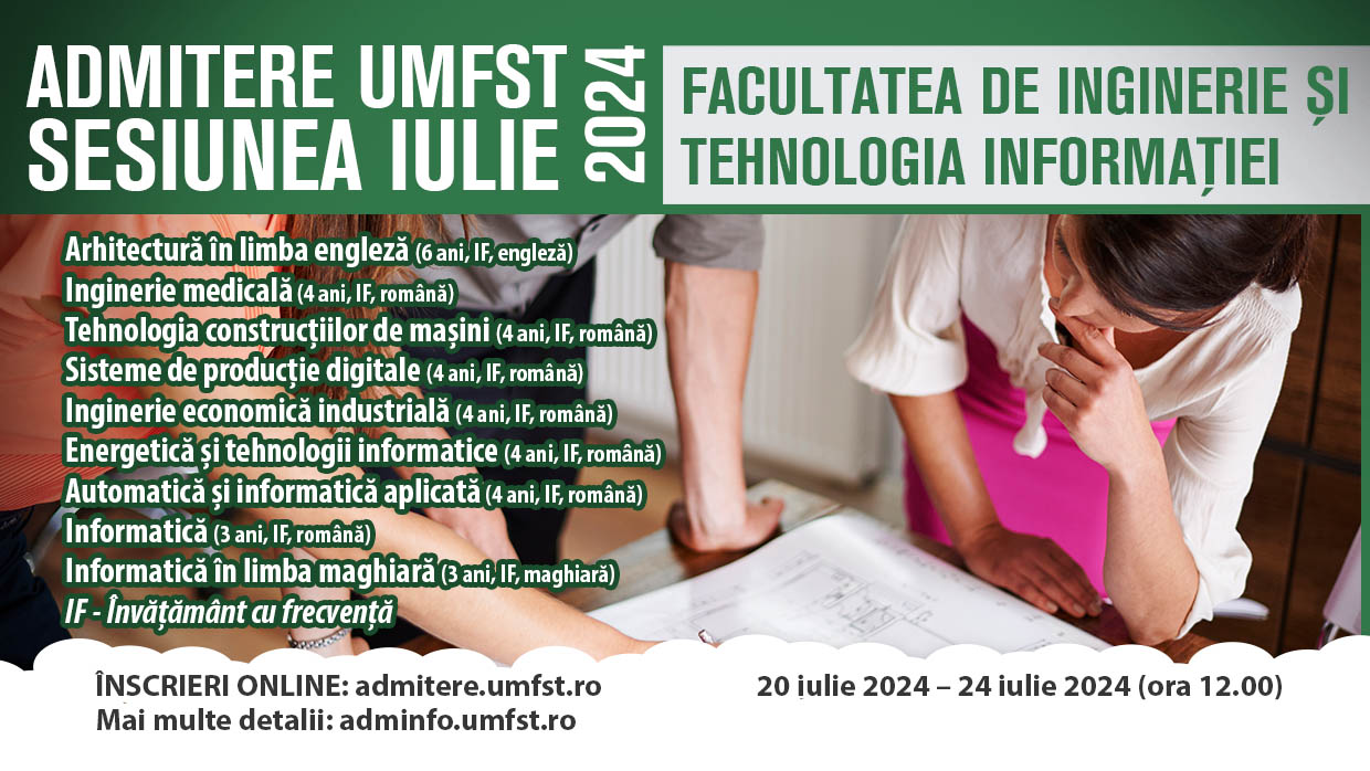 Înscrierile online la admitere vor avea loc în perioada 20 – 24 iulie 2024 prin intermediul platformei: https://admitere.umfst.ro/. Calendarul admiterii și informații privind locurile la buget și cele cu taxă se regăsesc pe site-ul: https://adminfo.umfst.ro/.