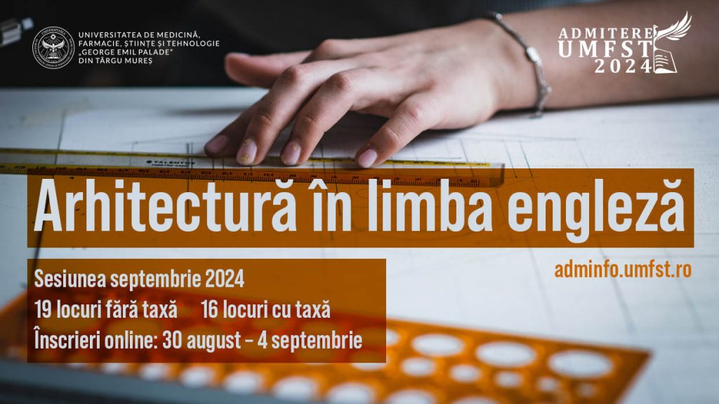 UMFST G.E. Palade Târgu Mureș informează candidații cu privire la admiterea la programul de studii Arhitectură în limba engleză din cadrul Facultății de Inginerie și Tehnologia Informației. În sesiunea de admitere din septembrie 2024 sunt disponibile 19 locuri fără taxă și 16 locuri cu taxă. Înscrierile online (24/24h) vor avea loc în perioada 30 august […]