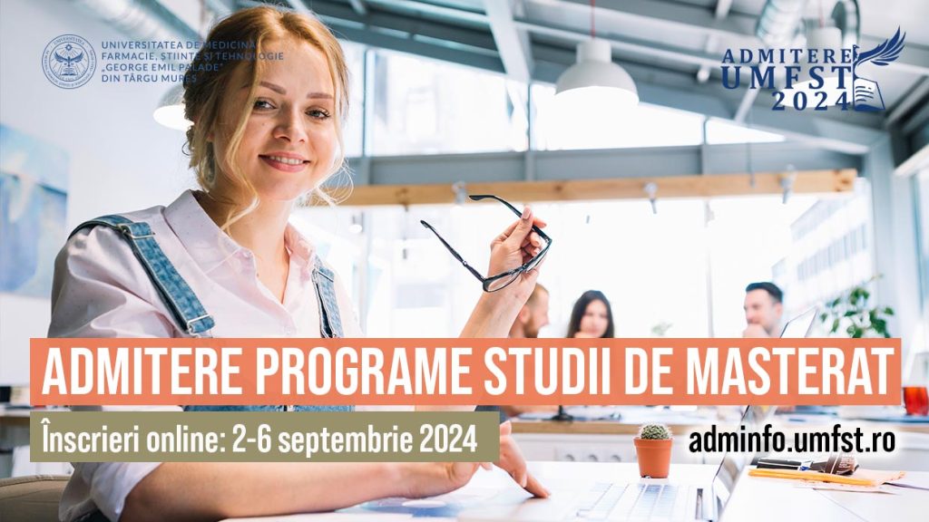 UMFST G.E. Palade Târgu Mureș informează că începând de luni, 2 septembrie 2024, se fac înscrieri online pentru admiterea la programele universitare de studii de masterat, sesiunea septembrie 2024. Locurile disponibile pentru sesiunea de toamnă se pot consulta accesând: https://adminfo.umfst.ro/admitere-septembrie-2024/. Înscrierile se realizează aici https://admitere.umfst.ro/ până vineri, 6 septembrie 2024.