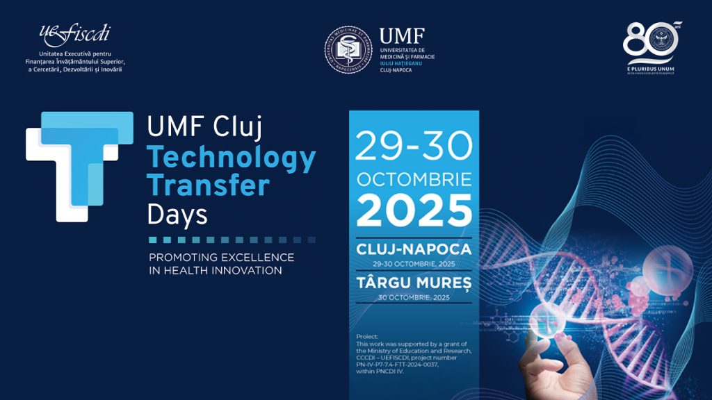 UMFST G.E. Palade Târgu Mureș invită comunitatea academică și comunitatea locală să participe, în data de 30 octombrie 2025, la evenimentul „UMF Cluj Technology Transfer Days, secțiunea UMFST Târgu Mureș: inovații, cercetare și transfer tehnologic în sănătate și domenii conexe”, dedicat educației, științei, inovației și transferului tehnologic.