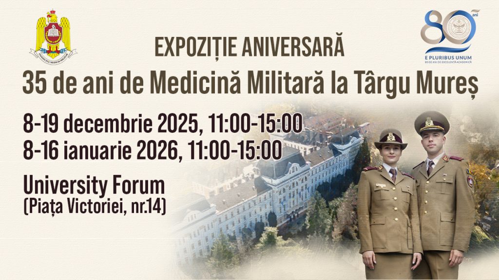Universitatea de Medicină, Farmacie, Științe și Tehnologie „George Emil Palade” din Târgu Mureș și Secția de Pregătire Medico-Militară Târgu Mureș anunță desfășurarea, în perioada decembrie 2025 – ianuarie 2026, a unei Expoziții dedicate istoriei medicinei militare românești.