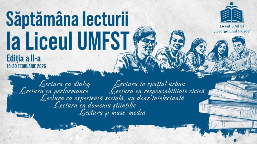 Liceul UMFST „George Emil Palade” anunță organizarea, în perioada 15-20 februarie 2026, a evenimentului „Săptămâna lecturii”, un demers care promovează lectura și încurajează cititul în comunitate.