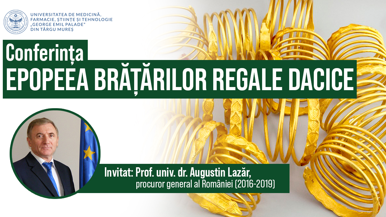 Studenții UMFST G.E. Palade Târgu Mureș, programele de studii de licență Istorie și Drept și programul de studii de masterat Istorie și turism cultural, sunt invitați să participe miercuri, 17 aprilie 2024, ora 11:00, în Aula Magna (str. Nicolae Iorga, nr. 1), la conferința „Epopeea brățărilor regale dacice”, susținută de prof. univ. dr. Augustin Lazăr, procuror general al României (2016-2019).