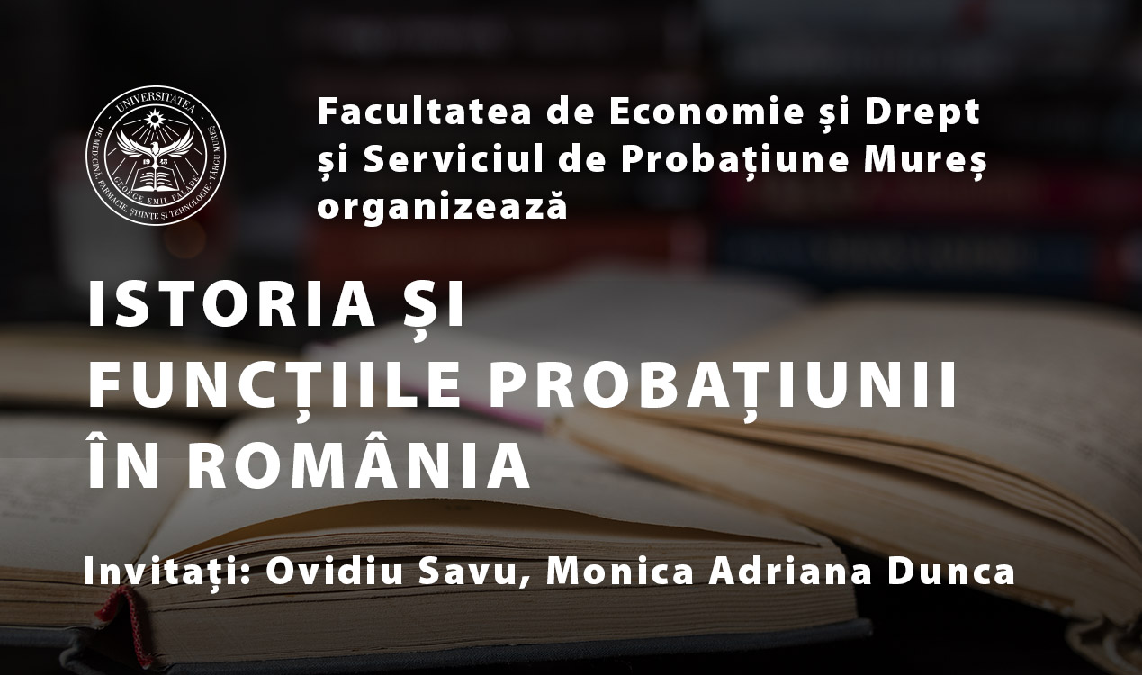 Facultatea de Economie și Drept, UMFST G.E. Palade Târgu Mureș, și Serviciul de Probațiune Mureș organizează marți, 31 octombrie 2023, ora 10:00, în sala C26 (str. Livezeni, nr. 69), evenimentul intitulat „Istoria și funcțiile probațiunii în România”.  Invitați: Ovidiu Savu și Monica Adriana Dunca.