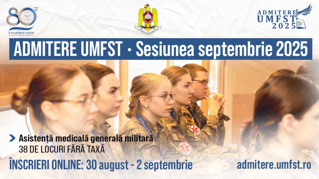 UMFST G.E. Palade Târgu Mureș informează viitorii candidați la admitere că Institutul Medico-Militar, prin Secția de Pregătire Medico-Militară Târgu Mureș, alocă 38 de locuri fără taxă la programul de studii Asistență medicală generală militară – sesiunea septembrie 2025.