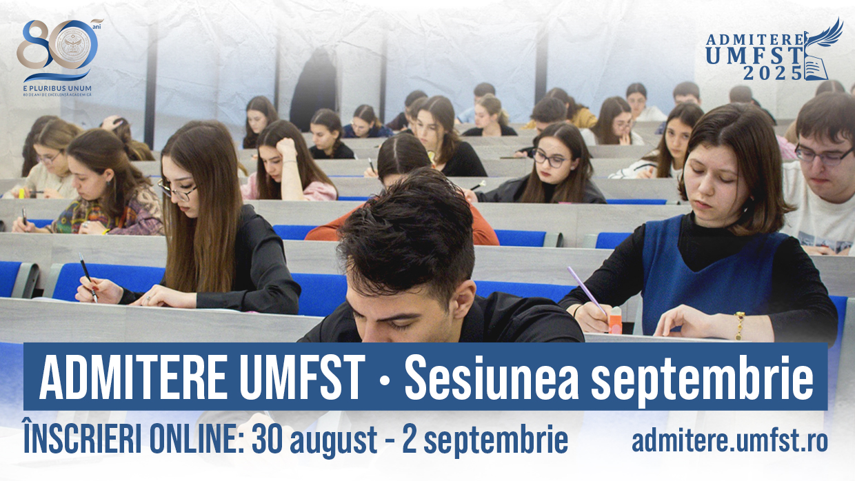 Înscrierile online (24/24h) vor avea loc în perioada 30 august – 2 septembrie 2025 prin intermediul platformei https://admitere.umfst.ro/.