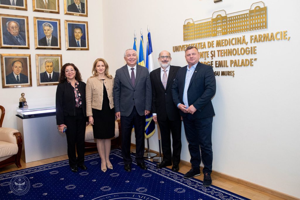 Invitații străini și conducerea UMFST G.E. Palade Târgu Mureș au purtat discuții în vederea extinderii colaborărilor care facilitează mobilitățile academice Erasmus pentru studenți și cadre didactice, precum și cooperări care să dezvolte legăturile interculturale.