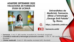 • Farmacie – 10 locuri cu taxă la linia de studii în limba română + 10 locuri la buget la linia de studii în limba maghiară
