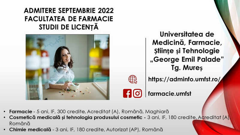 • Farmacie – 10 locuri cu taxă la linia de studii în limba română + 10 locuri la buget la linia de studii în limba maghiară