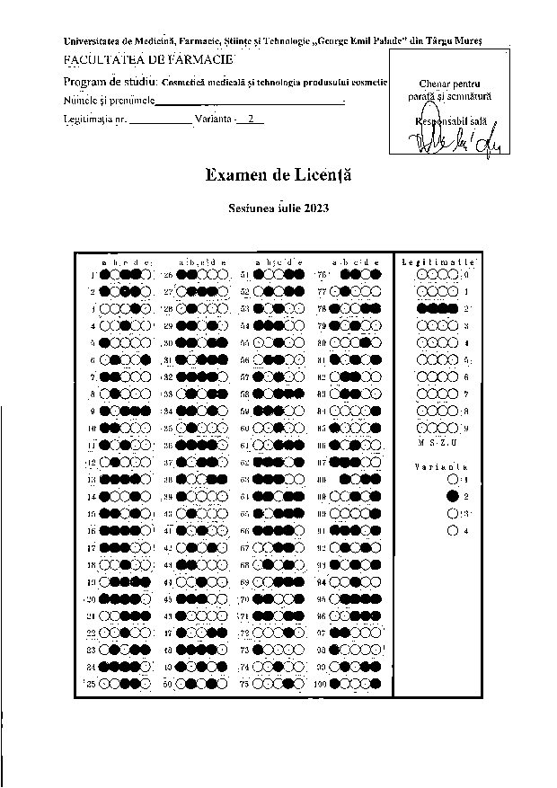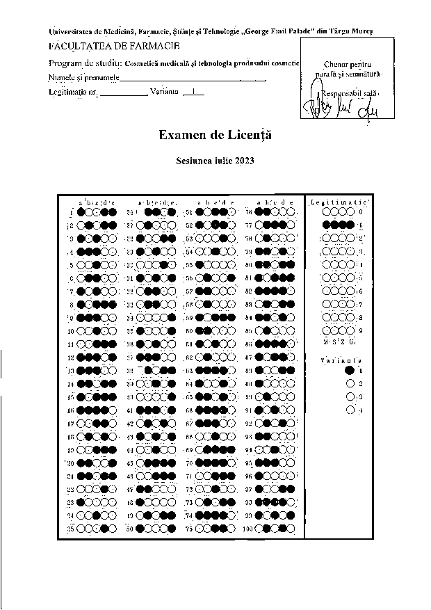 Bareme / Teste corecte – examen Licență, Facultatea de Farmacie, sesiunea iulie 2025