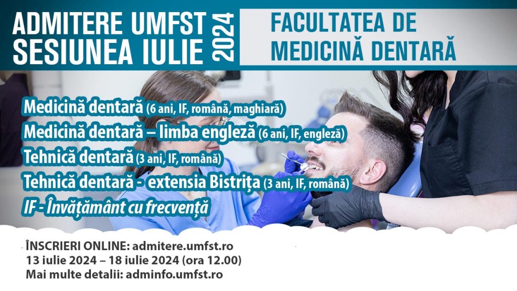 Înscrierile online vor avea loc în perioada 13-18 iulie prin intermediul platformei: https://admitere.umfst.ro/, iar examenul de admitere va avea loc în data de 21 iulie 2024.