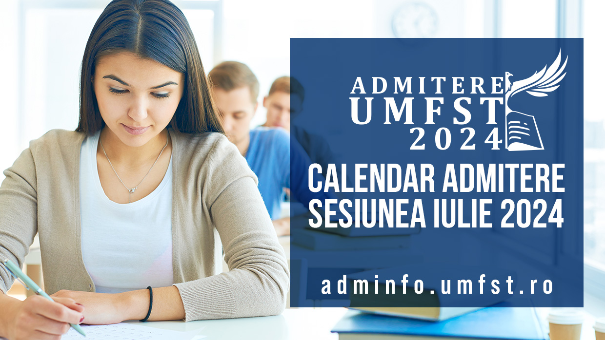 Calendarul admiterii este disponibil aici: https://adminfo.umfst.ro/wp-content/uploads/2024/01/calendar-admitere-2024-iulie_site.pdf.