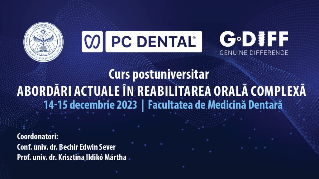 Facultatea de Medicină Dentară, UMFST G.E. Palade Târgu Mureș, în parteneriat cu PC Dental, organizează, în perioada 14-15 decembrie 2023, cursul postuniversitar „Abordări actuale în reabilitarea orală complexă”, în cadrul căruia vor fi aduse în prim-plan cele mai recente inovații și practici în reabilitarea orală.