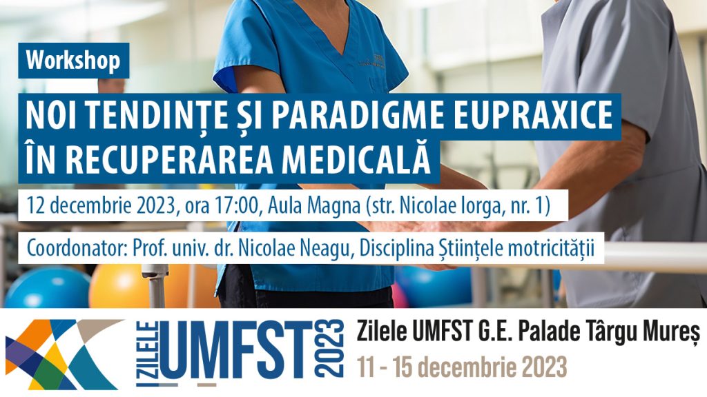 Disciplina Științele Motricității din cadrul Facultății de Medicină, UMFST G.E. Palade Târgu Mureș, organizează marți, 12 decembrie 2023, ora 17:00, în Aula Magna (str. Nicolae Iorga, nr. 1), workshop-ul „Noi tendințe și paradigme eupraxice în recuperarea medicală”, coordonat de prof. univ. dr. Nicolae Neagu.