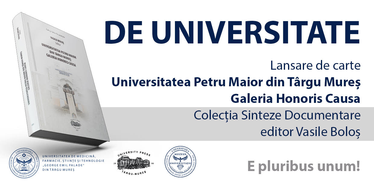 Editura University Press și Muzeul Universității „George Emil Palade” organizează, cu această ocazie, lansarea cărții „Universitatea Petru Maior din Târgu Mureș. Galeria Honoris Causa”. Acesta este al treilea volum din Colecția Sinteze Documentare, publicată sub coordonarea prof. univ. em. dr. ing. Vasile Boloș, rector al Universității „Petru Maior” din Târgu Mureș în perioada 1990 – 2004. Colecția este o veritabilă declarație de asumare a dorinței de a păstra și promova istoria Universității.