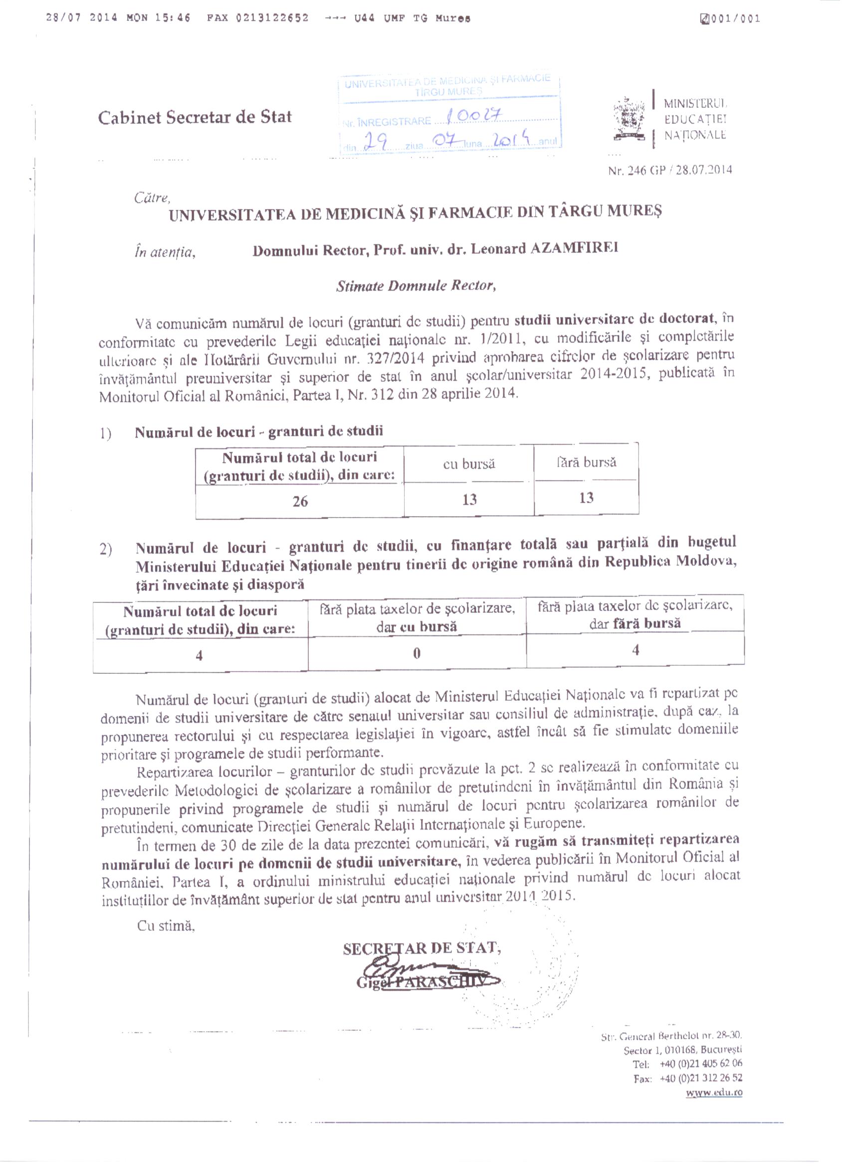 Numarul locurilor pentru doctoranzi, cu frecventa, prin granturi de studii(cu bursa, fara bursa): 26 (adresa MEN nr. 246 GP/28.07.2014)