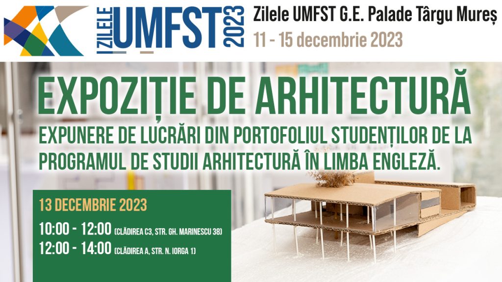 Cu ocazia Zilelor UMFST G.E. Palade Târgu Mureș, va avea loc miercuri, 13 decembrie 2023, în intervalele orare 10:00 – 12:00 (clădirea C3, str. Gh. Marinescu 38) și 12:00 – 14:00 (clădirea A, str. N. Iorga, nr. 1), o expoziție de arhitectură cu lucrări din portofoliul studenților de la programul de studii Arhitectură în limba […]