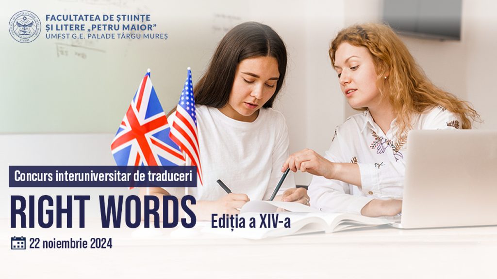 Departamentul SL1, Facultatea de Științe și Litere „Petru Maior”, UMFST G.E. Palade Târgu Mureș, organizează, în data de 22 noiembrie 2024, ora 14.00, ediția a XIV-a a Concursului interuniversitar de traducere Right Words, care se adresează studenţilor de la programele de studii care au limba engleză ca specializare principală sau secundară (licență – anii II, III) și celor care studiază limba engleză ca limbă modernă în cadrul programelor de studii din domeniul Sănătate.
