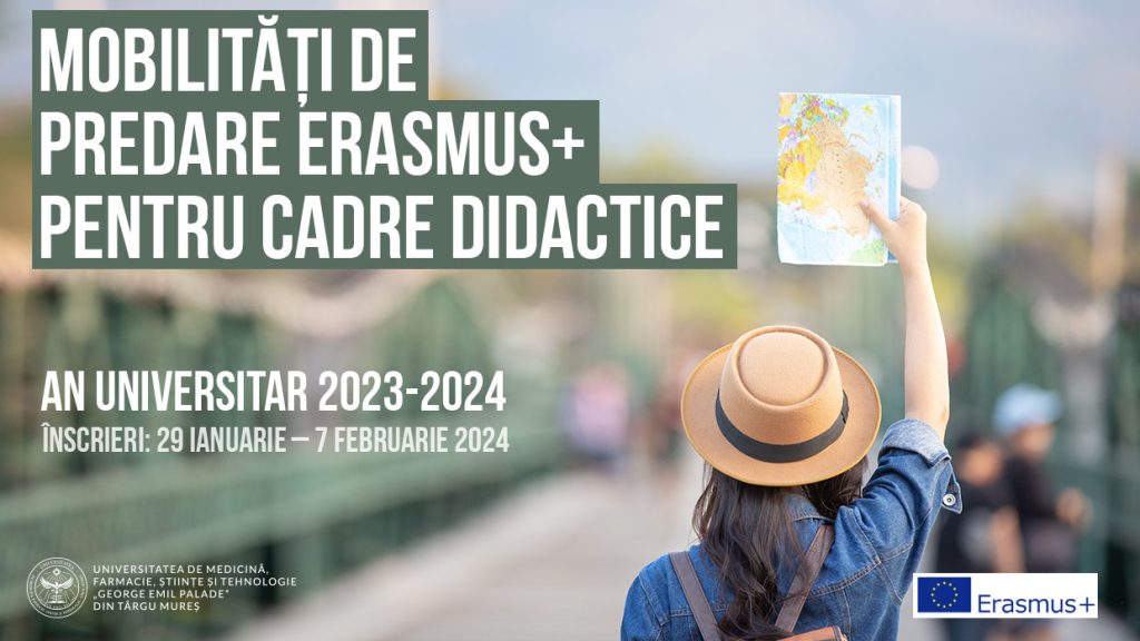 Biroul Erasmus+ al Departamentului de Relaţii Internaționale, UMFST G.E. Palade Târgu Mureș, organizează concurs de selecție pentru mobilităţi de predare Erasmus+, în domeniile Sănătate, Științe și Tehnologie.