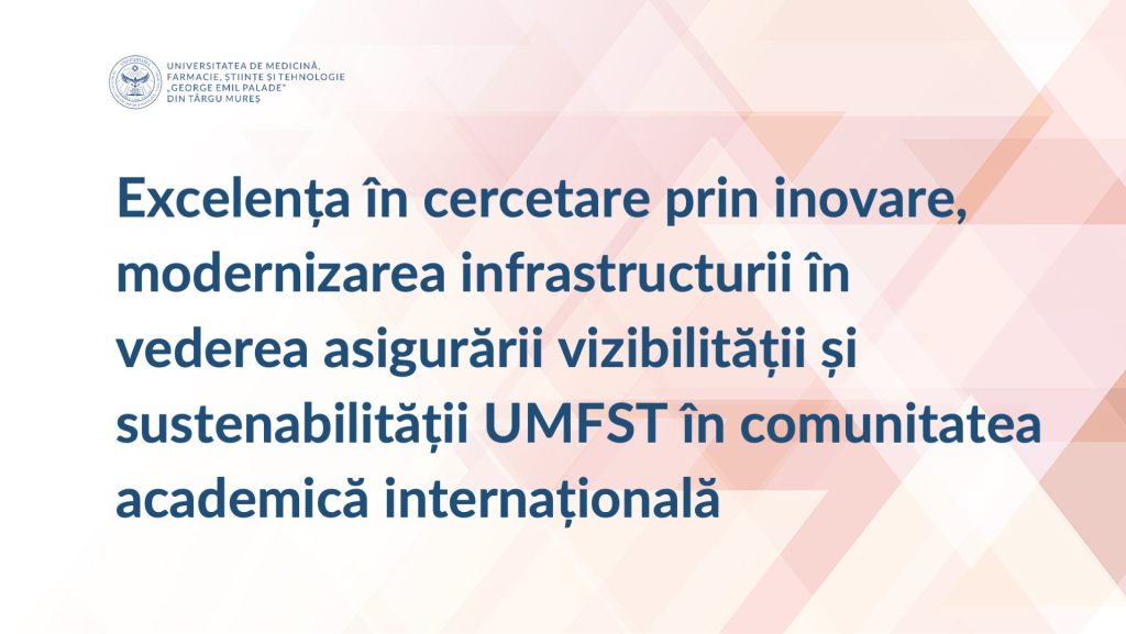 Proiectul CerExUMFST a avut ca obiectiv principal dezvoltarea sistemului de cercetare și inovare din cadrul UMFST G.E. Palade Târgu Mureș, prin modernizarea infrastructurii și optimizarea proceselor de cercetare. Prin implementarea acestui proiect, s-a urmărit consolidarea colaborărilor internaționale, facilitarea diseminării rezultatelor științifice și alinierea activității de cercetare la strategiile UMFST și naționale (2022-2027). În cadrul proiectului CerExUMFST, au fost realizate investiții semnificative în Unitatea de Cercetare Științifică și Dezvoltare Tehnologică (UCSDT) și anume în Centrul de Cercetări Avansate Medicale și Farmaceutice (CCAMF), Biobaza și Stația Experimentală (BSE), contribuind astfel dezvoltarea infrastructurii și la creșterea performanței activităților de cercetare.