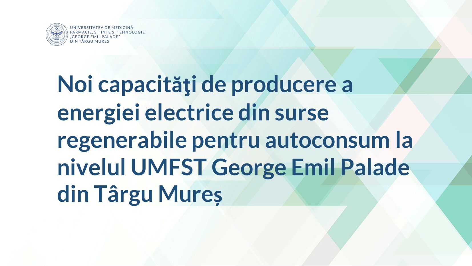 Noi capacităţi de producere a energiei electrice produsă din surse regenerabile pentru autoconsum la nivelul UMFST George Emil Palade Târgu MureșFinanțat din Fondul pentru Modernizare, în cadrul Programului – cheie 1 – Surse regenerabile de...