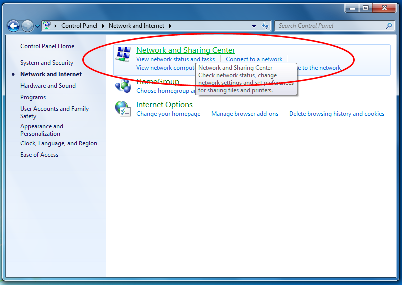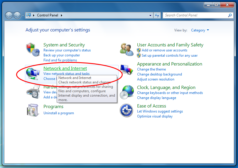 Dati click pe Start si deschideti Control Panel. Selectati "Network and Internet" ca in imaginea de mai jos: