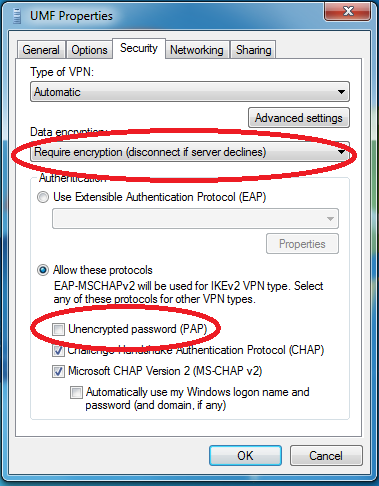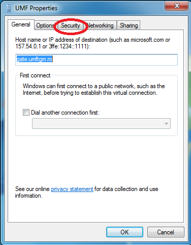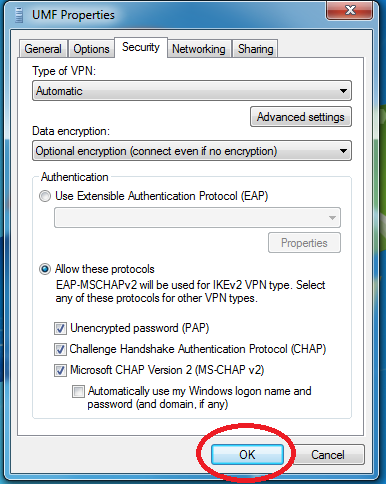 La "Data encryption" se alege optiunea "Optional encryption (connect even if no encryption)" si se bifeaza "Unencrypted password (PAP)", dupa care se apasa "OK". Dupa aceste modificari conexiunea de VPN este creata si va putea fi utilizata pentru accesarea serviciilor disponibile (acces la reviste online si verificare email)