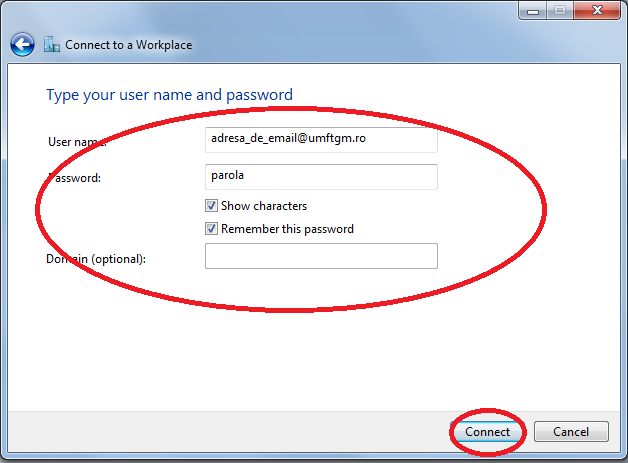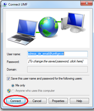 La User name se introduce adresa de e-mail de UMF si parola respectiva, optional bifandu-se "Remember this password" (niciodata pe un calculator public). Dati click "Connect"