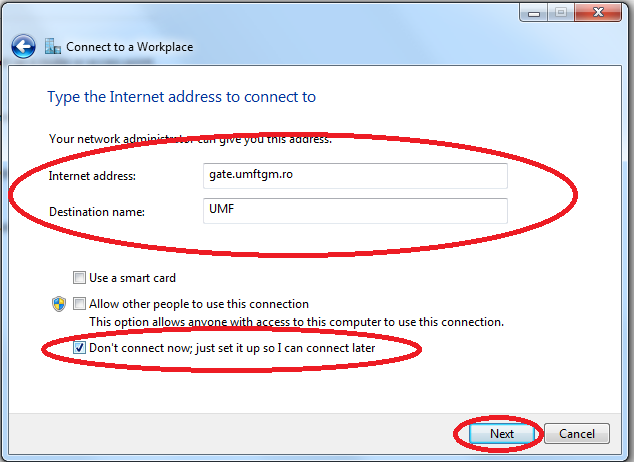 Se completeaza cu adresa serverului si numele conexiunii (ca in imagine), bifandu-se "Don't connect now....". Apasati "Next":